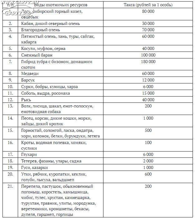 Таксы для исчисления размера вреда, причиненного охотничьим ресурсам
