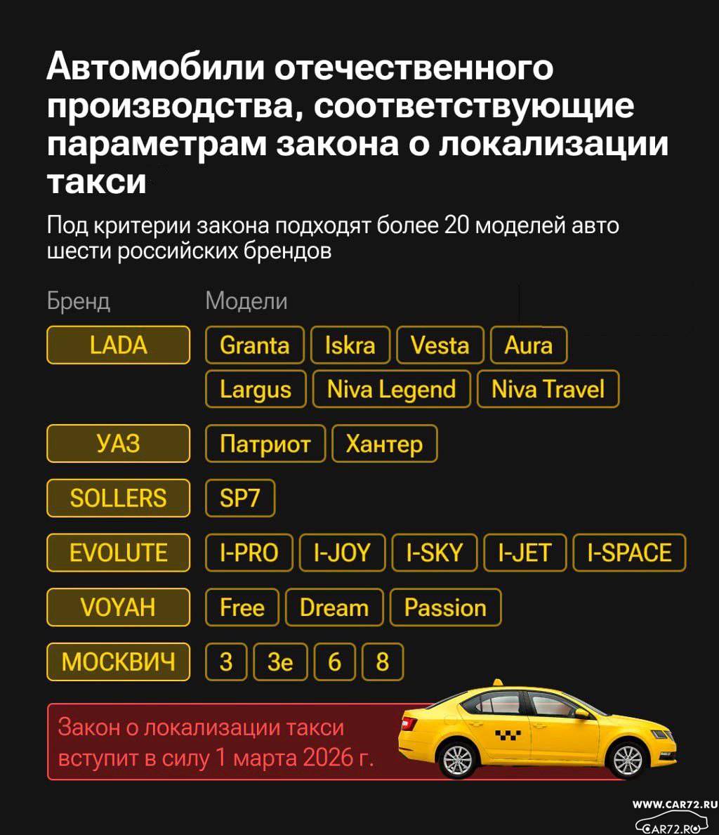 Опубликован предварительный список автомобилей, соответствующих новому закону о локализации такси, который вступит в силу 1 марта 2026 года.